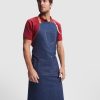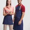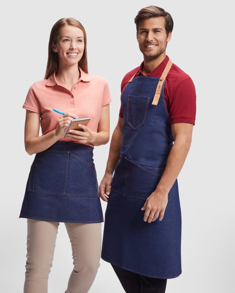 Delantal largo vaquero. · Cinta en el cuello a contraste de sarga con botón metálico y tres ojales para ajuste. · Dos cintas a contraste de sarga para ajustar en la cintura. · Bolsillo centrado plaqué en pecho. · Bolsillo frontal con costura central que divide el bolsillo en dos. · Bolsillo para bolígrafo en lateral derecho. · Un bolsillo interno en lateral izquierdo. · Etiquetado Roly WRK exterior.