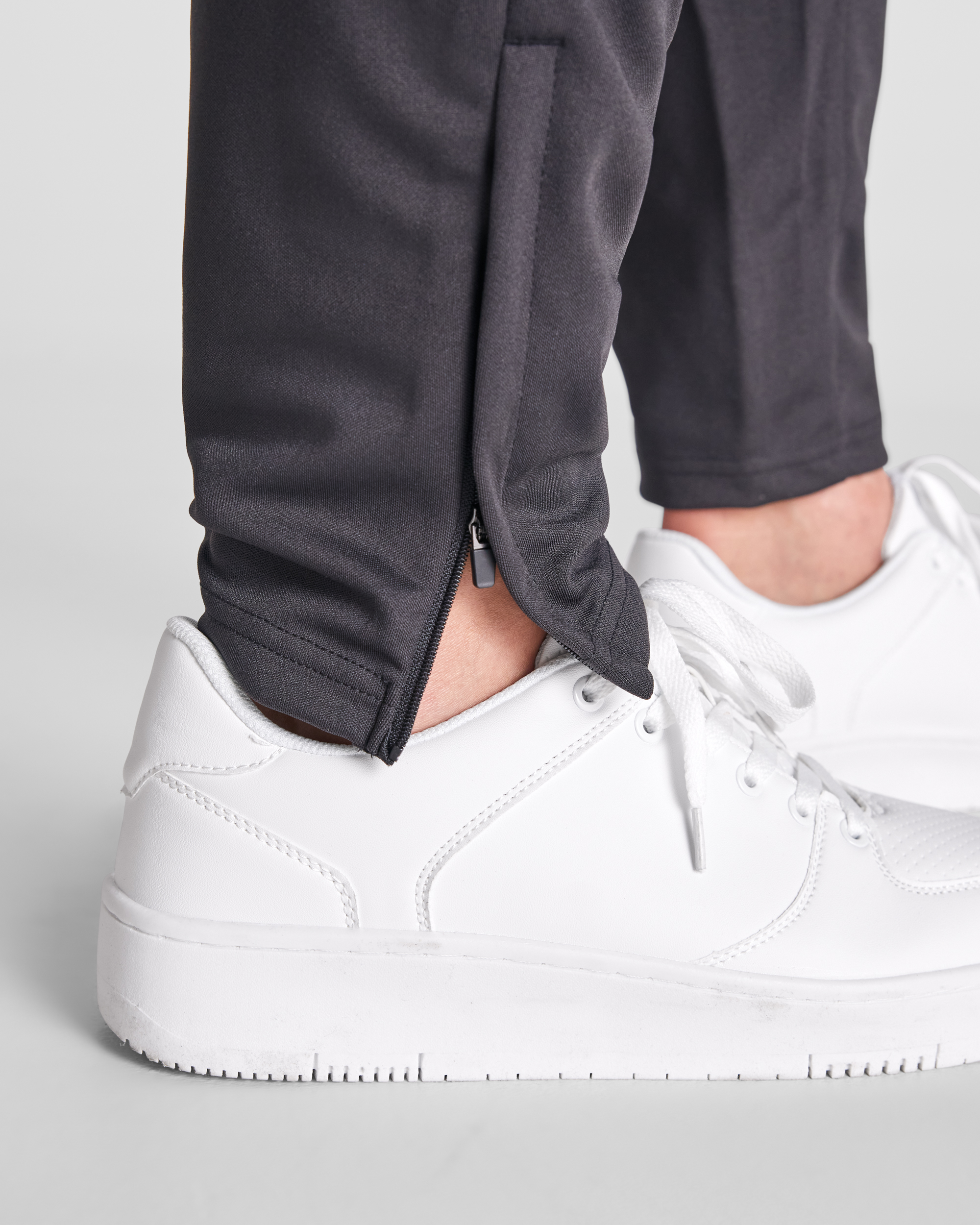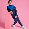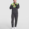 Chándal tejido ligero no perchado. Chaqueta de cuello alto y cubrecosturas a contraste. Piezas a contraste de color en pecho y vivo. Cremallera frontal. Bolsillos laterales con cremallera. Cuello, puños y cintura en canalé de 2×2. Pantalón corte pitillo con cintura elástica y cordón ajustable. Pieza lateral a contraste de color y cremalleras en los tobillos con tapeta.