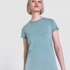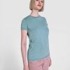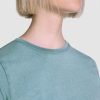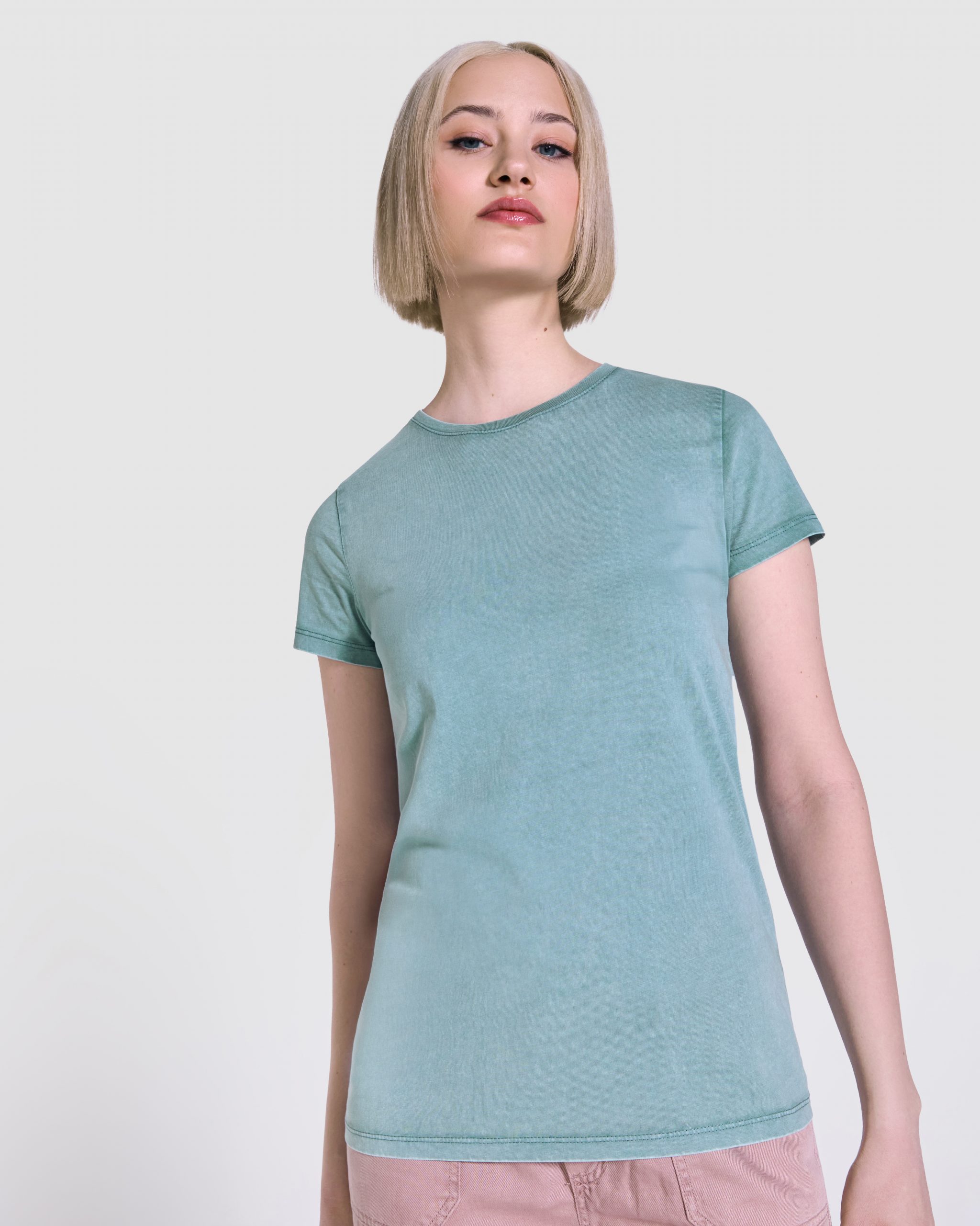 Camiseta woman de manga corta en algodón peinado efecto lavado. Cuello redondo en canalé 1×1. Cubrecosturas en cuello del mismo tejido. Costuras dobles en laterales y sisas.