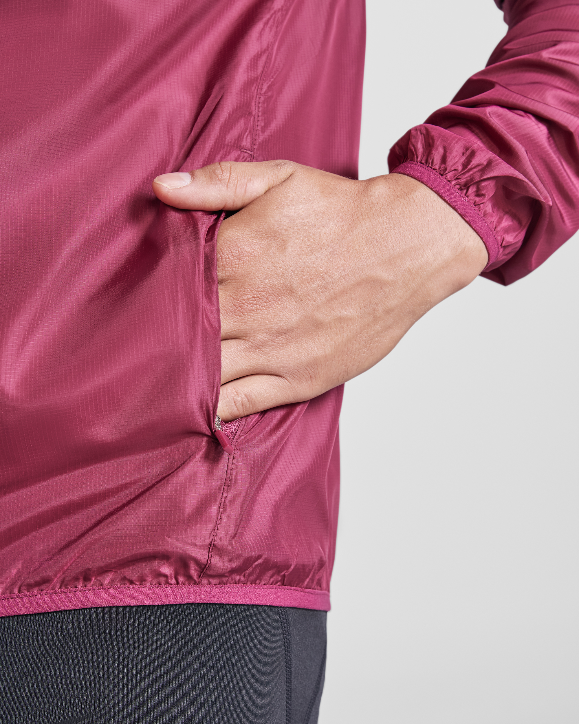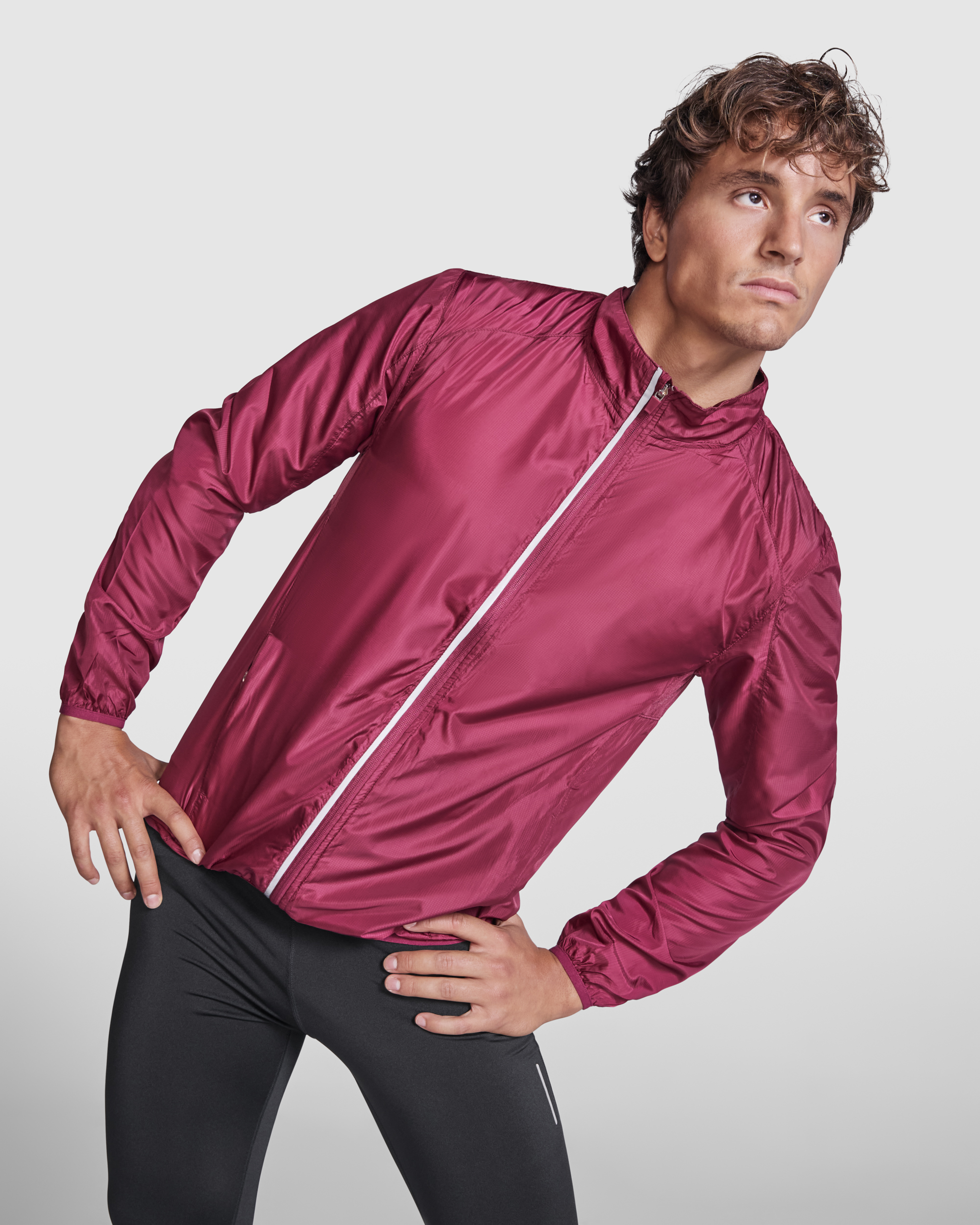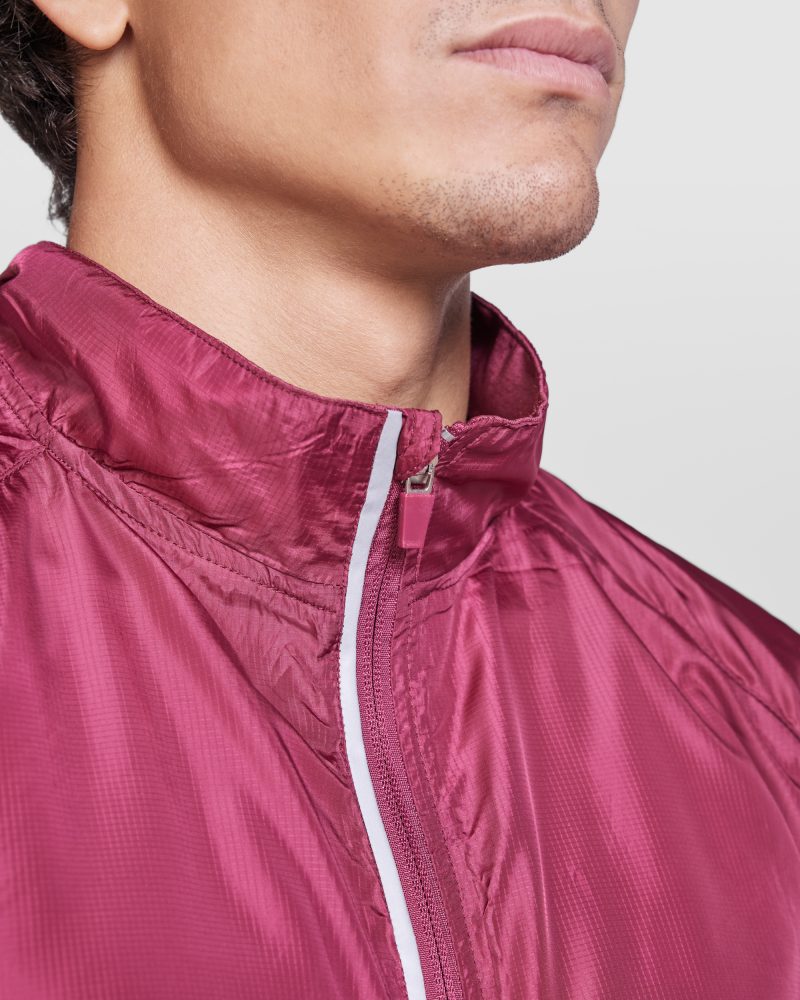 Cortavientos unisex ligero y transpirable. Cremallera frontal invertida con detalle reflectante. Bolsillos laterales con cremalleras invertidas y dos bolsillos interiores. Puños con ribete elástico al tono. Detalle reflectante en espalda.