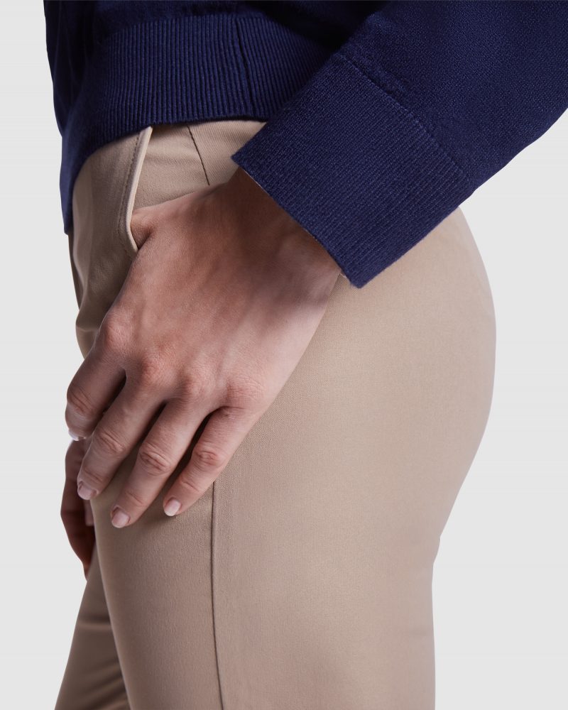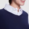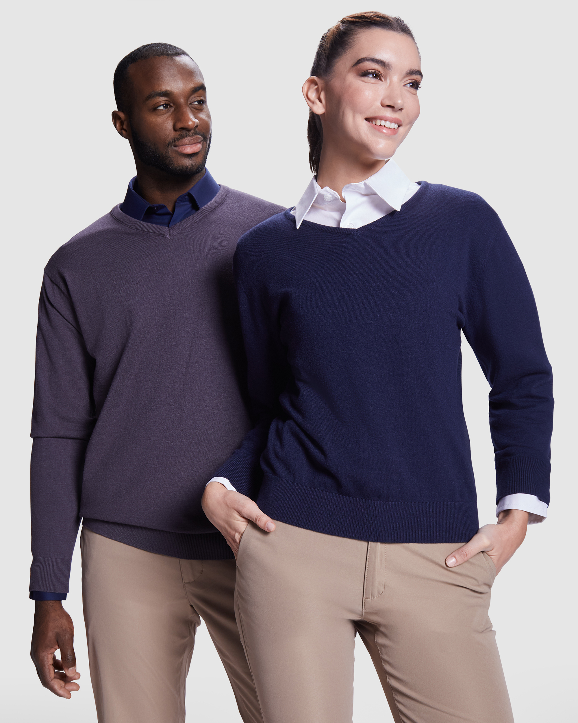 Jersey mujer con escote de pico. · Punto fino. · Puños y bajo en punto canalé 1×1.