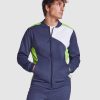 Chaqueta deportiva con cremallera frontal perchada. Bolsillos laterales con cremallera. Piezas a contraste de color, una blanca en pecho especial para bordados. Cuello, puños y cintura en canalé de 1×1.