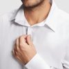 Camisa manga larga. · Tejido stretch. · Cuello clásico camisero. · Costura de hombro adelantada. · Canesú espalda. · Tapeta con botones al tono. · Puños con abotonadura doble y pinza al lado de la tapeta de puño con un botón más pequeño. · Bajo con forma redondeada.